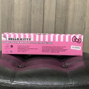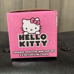This adorable mini mug set is part of the Hello Kitty collection from Sanrio. It is a mini mug set of 4 sculpted of Hello Kitty's sweet head. Each mug features a different colored bow. Each mug is about 2 inches in height and holds about 3.5 oz. This set is new and have never been used. Set is sealed in the original packaging. Set is free of chips & cracks. Set comes from a non smoking home. Item is sold AS IS. If you have any questions about the listed item or its packaging or shipping please message me before buying. PLEASE REVIEW PICTURES!!