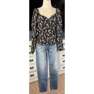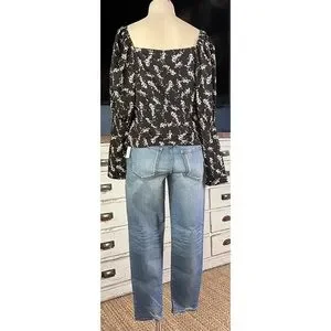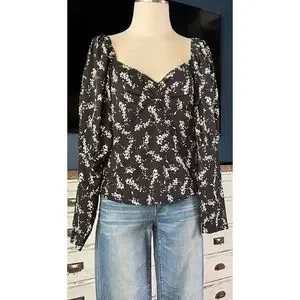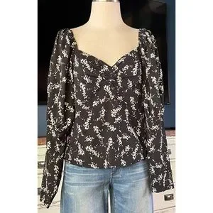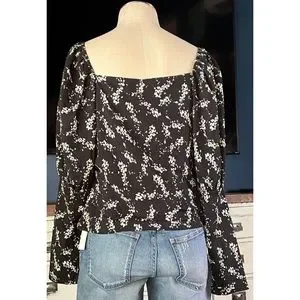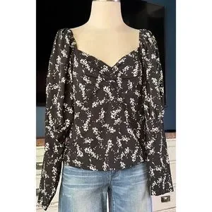The pretty top has long sleeves that have a dramatic tiered puff. The flatter v-neck bodice has a romantic gathered sweetheart silhouette. The blouse is short at 22”.