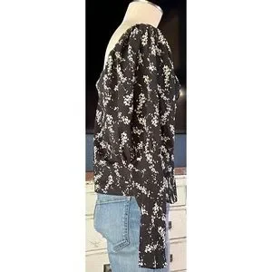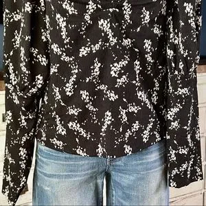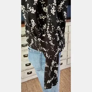 This beautiful black blouse by Anthropologie has a swirling white floral pattern.