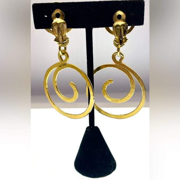 Vintage Gold Tone Hammered Scroll Design Dangle Clip In Earrings Made in Greece. Only one earring is marked. Beautiful dangling earrings. Minor signs of wear consistent with age. In beautiful vintage condition. 3” X 1 3/4”