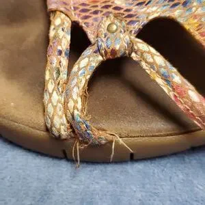 Condition: good used condition- some life left in these sandals! Significant wear to the insoles and soles, leather on the inside of the straps is peeling, some threads coming out of the snakeskin (purely cosmetic - no effect on wearability.) See pictures for details.
