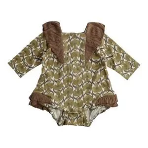 Features color block detailing, bubble body, extra puffy ruffle detail, front button placket, and snaps in legs.