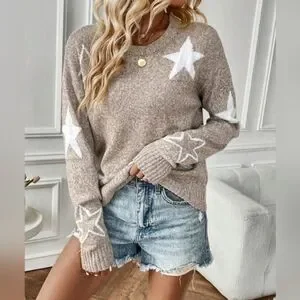 New Chic Star Pattern Knit Pullover Sweater Top Khaki Tan White