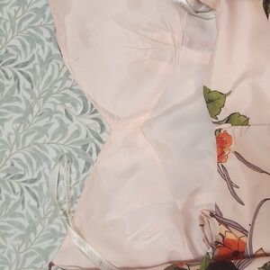 gloral print with light satin feel. back zipper, fully lined, side pockets.