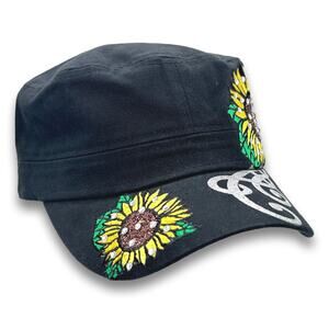 Sunflower Graphic Cadet Hat Rhinestone Round Top BDU Baseball Castro Cap