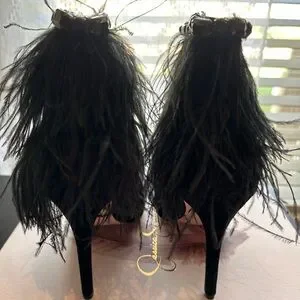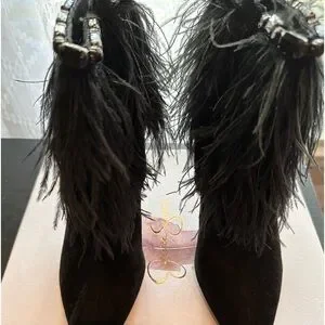 Zipper closure at inner ankle; rhinestone embellishment and feather details at upper