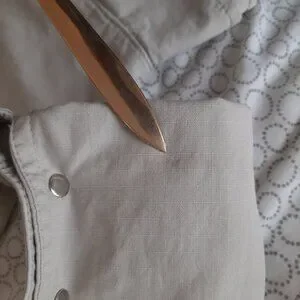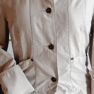 Great transitional piece for spring or fall. Get the look of Free People in a vintage DKNY jacket! A light cotton canvas material with metal buttons down the front. The cuffs are versatile in that they can be left long or folded into a 4-inch French cuff. The double peplum bottom lends a bit of feminine flair. DKNY JEANS is pressed into each cuff.