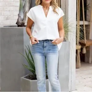 Our Blake Top looks and feels expensive without the high price tag! This piece is constructed with a mid-weight fabric, v neckline, mandarin collar and capped sleeves. We’re obsessed with how chic this top is and can be worn dressed down or dressed up for special occasions! Pair with denim and wedges for a compliment-worthy look.