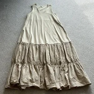 Tan knit maxi dress with 2-tiered ruffle bottom. Sleeveless. Side pockets. Super comfy flattering dress for all seasons. In excellent shape. Size L. No smoking/pet home. $45