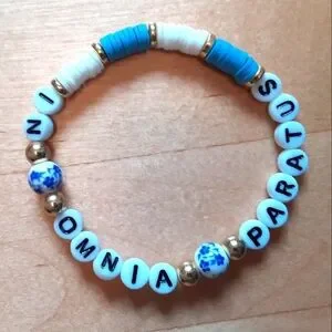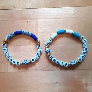 Set of two handmade beaded stretch bracelets. One says "GILMORE GIRLS," and the other says "IN OMNIA PARATUS," a phrase from the show that means "ready for anything."