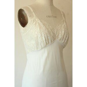 Sweet vintage Van Raalte slip circa 1950s in palest off white/ ivory nylon. The bodice is really pretty with embroidered lace and adjustable straps. The same lace is echoed along the bottom hem. Label reads: Van Raalte, Sauvette, Nylon, and there is the size 36A. But do see the measurements below as well.