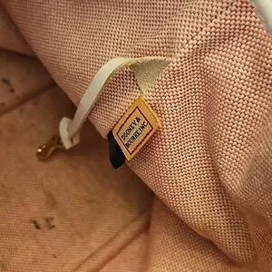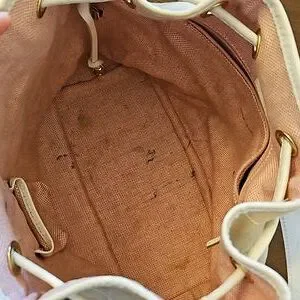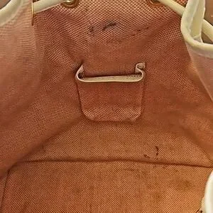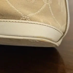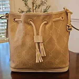 Dooney and Bourke Monogram Signature Drawstring Bucket Shoulder bag with White Leather Trim. Includes duck tag. Outside canvas is clean. Leather shows some minor wear on corners and trim. Inside does have multiple ink stains. These can likely be cleaned off. See pics. This is a great neutral everday bag. Approx measurements 10"×14"×6.25"