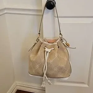 Dooney & Bourke Monogram Signature Drawstring Bucket Shoulder Bag White Leather