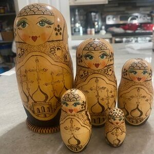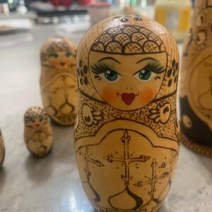 Preowned hand painted hand carved wood nesting dolls, in excellent condition no imperfections. Clean and smoke free