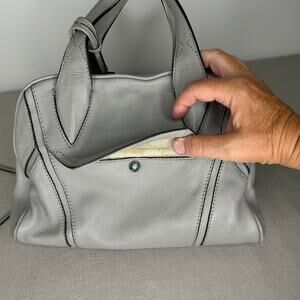 Aimee Kestenberg leather purse. Grey leather with two top openings with snaps and center zip area. Inside pockets. Outside snap pocket. Tassel tag. Metal feet.
