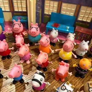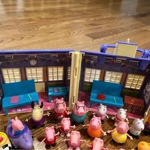 Peppa schoolhouse with manual working school bell. Over 30 Peppa characters (including 5 vehicles) and school furniture as pictured. All but 2 characters are in great condition.