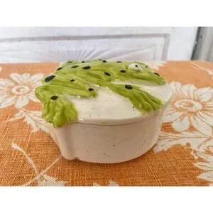 Unearth the charm of the 1970s with this vintage ceramic frog trinket box. Perfect for storing small items, this retro piece adds a touch of whimsy to any decor. This measures about 5.5" across and 2" ta;;. It has no chips or cracks and is in good vintage condition.
