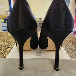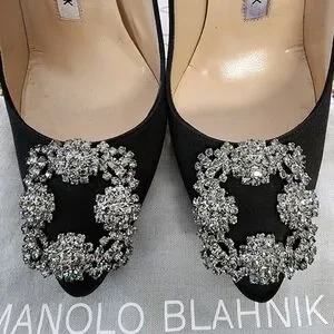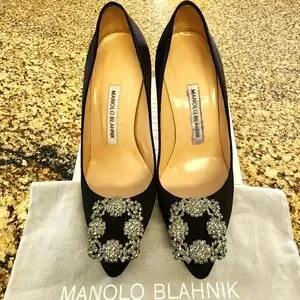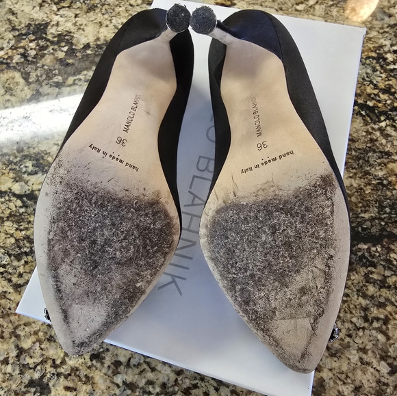 Beautiful Hangisi in black. No crystals missing. No damage. Small scuffs inside right shoe as shown in last picture. Very difficult to see. Only some ink smudged on the manolo name on the inside of one of the shoes. Size 36