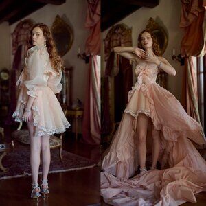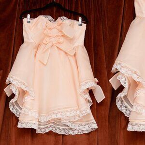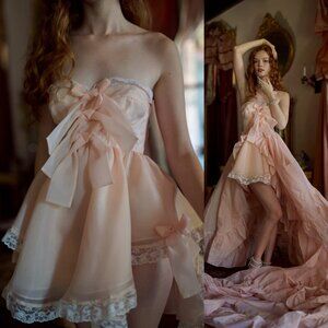 This little strapless dress features generous lace trim and comes topped with a puffed, long-sleeved bolero. You can remove the bolero at your leisure, and pair with other looks. Underwire cups and boning add structure, while a cascade of bows act as instant oxytocin.