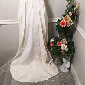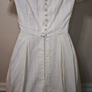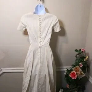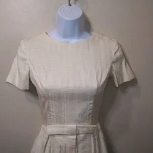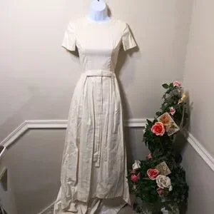 EUC Beautiful vintage 1950's, embroidered stripe ivory brocade handmade wedding dress with short sleeves, jewel neckline, and bow at waist. Dress style is timeless with princess seaming, button and metal zipper closure with covered buttons down the back to waist. This was handmade for the previous owner who was married in Paris as her husband was stationed in Europe during the 1950-60's. Only flaws that I saw were a few small spots on the lower back of the skirt train. They may come out with spot or dry cleaning, I didn't try to get them out myself as I'm not an expert on cleaning vintage clothing. Bust 15 1/2 inches, waist 11, hips 23, length in front 52 inches, back approx 68 1/2 to end of train. Please see all photos.