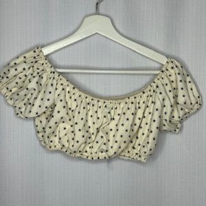 Lovers and Friends off white top with blue stars crop top in size medium. Elastic around neckline and hem. Can be worn off or on shoulders. Lined for modesty. Polyester 97%, spandex 3%, lined in polyester blend, hand wash.