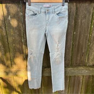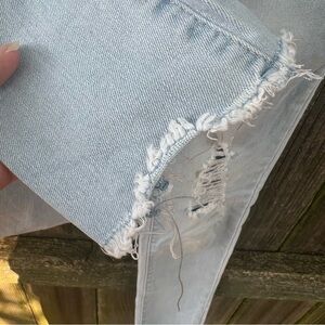Excellent very gently used condition, no stains, soft stretch light denim, factory ripped holes add style, fringe hemmed bottom with stitching to prevent fraying.