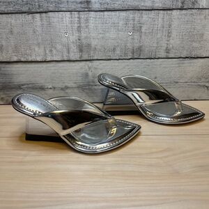 Good American Cinder F*cking Rella Clear Wedge Thong Sandal Silver Patent Leather