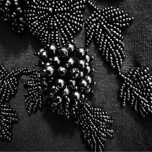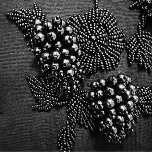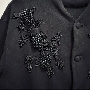 This retro beaded cardigan sweater from Vivienne Tam is embellished with clusters of shiny black beaded grapes and flowers stitched across the front and a mini cluster on the sleeves. Slight V-neckline and tiny fabric covered buttons adorn the front.
