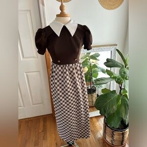 1970’s True Vintage Maxi dress, no size tags but would most likely fit women’s 4, Measurements taken while the garment was laying flat, arm pit to arm is 16” waist is 12” and total length is 48”. The tie is removed, it just is held on with a small safely pin. No flaws to note. Zipper in back to get on an off. Check out my closet for similar looks. I’m always open to offers.