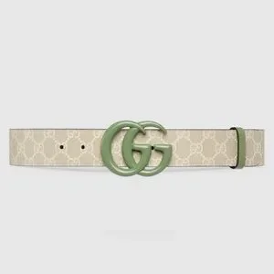 A contemporary take on a Gucci archival belt buckle from the '70s, the Double G is repurposed and appears atop this belt. Here, the accessory is crafted in soft GG Supreme canvas and defined by leather details. Beige and white GG Supreme canvas with leather details, Pbrass hardware with ceramic effect finishing, Double G buckle, Buckle: 3"W x 2.4"H, 1.5" belt width, Made in Italy, Can be worn as a waist belt.