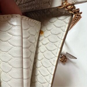 Stella McCartney Snake Bag. 100% authentic. Beautiful ivory color and gold tone hardware. Can wear it crossbody or hold it by the top handle. It opens up in an accordion style and can fit a surprising amount of things for its size. Measures 9” across, 6” tall, about 2.5” wide at base without things in the bag. Zippered interior pocket. Comes with original dust bag and tag. Overall good condition. Minor wear includes: tiny marks on front of bag (barely noticeable see photo 9) wear on corner, marks in interior folds of accordion (I think these may be from the glue of the bag, and bend in strap from being in storage on a hook. Nothing very noticeable. Bought for 1245. Ask any questions!