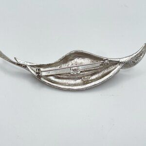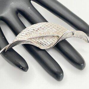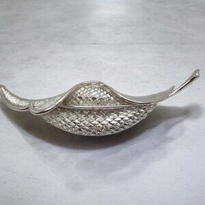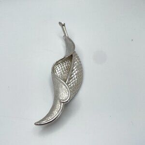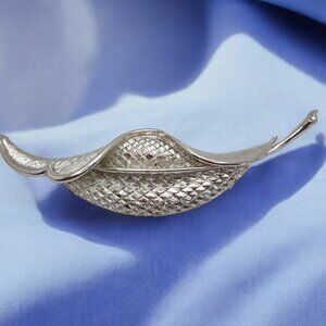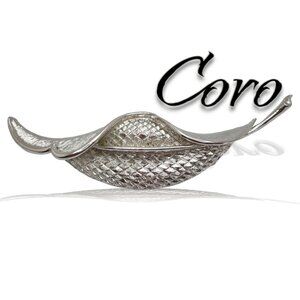 This silver-tone signed designer brooch by Coro is a stunning leaf with movement. I imagine it as a 'morning leaf', heavy with dew. The leaf has significant texture and flowing lines.