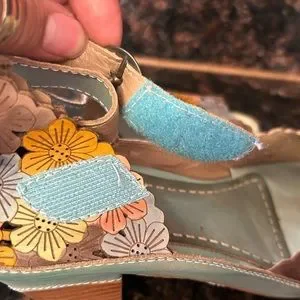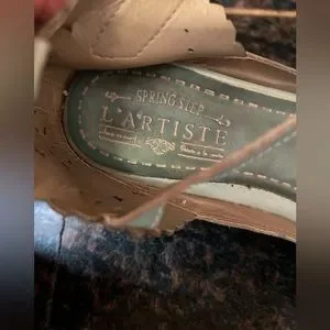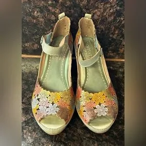 L'Artiste Style: AVNIA French inspired, beautful hand-painted leather peep toe sandal featuring a beautiful floral laser etching and cutout design, an adjustable Velcro ankle strap, and tonal stitchwork all on a leather-wrapped, stacked, comfort heel with a platform. Heel Height (approximately): 3"" Platform Height (approximately): 3/4"" Features: - Leather Upper. - Synthetic Lining. - Leather, Synthetic Insole. - Rubber Outsole. Open Toe/Almond Toe - Stacked Heel. - Imported - Disclaimer: L'Artiste products are made with natural tanned leather using traditional hand painting techniques. This unique finishing process is used to create a natural effect with color variations to deliver authentic look and beauty.