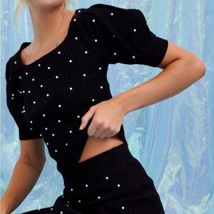 Knit Puff Sleeve Top and Mini Skirt Set With All Over Pearls