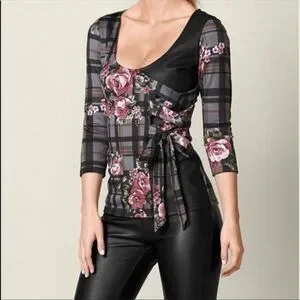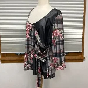 🌟PRICE REDUCED🌟FLORAL 💐PLAID Pink Black Faux Leather 3/4 Sleeve Top SIDE TIE