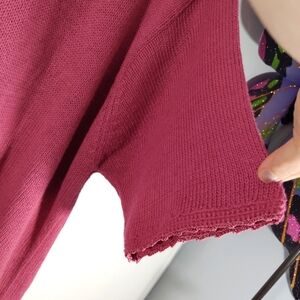 A lovely short-sleeved knit and crochet button down cardigan sweater! Beautiful embroidery and pearlescent beading add a touch of the whimsical to this piece. Pretty pink buttons down the front. In good pre-owned vintage condition without tears or stains. There is a tag with spare button attached. There is some wear or fade consistent with age. Underside of embroidery is fuzzy. Has shoulder pads. Please see pictures and video. From our smoke-free home 🏡