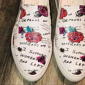 These sneakers are brand new and in excellent condition, but do not come with a box. They are white sneakers with floral detailing and wording saying different things. They are leather with synthetic soles. These are the only sneakers I have seen that have this same detail, if someone else has seen these being sold, please let me know.