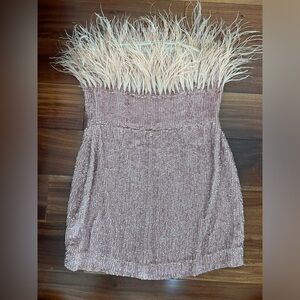Stand out in our Torin Dress. This show-stopping sequin mini dress features a strapless neckline and flirty feather trim at the top. Hidden zipper with hook-and-eye closure at the side. Shown here in Dusty Peach.