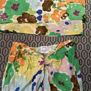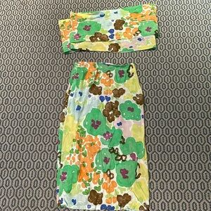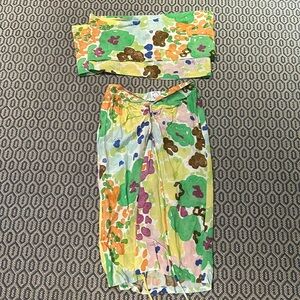 The Naomi Set features a midi length skirt that gathers to the front into a v shape at the waist, the top is a wrap-around scarf style that can be tied in multiple ways.