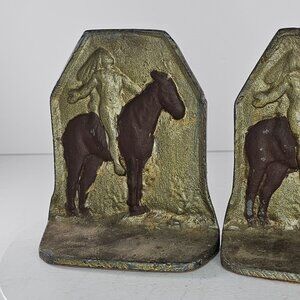 These Vintage Native American Appeal to the Great Spirit Cast Iron Bookends are perfect for your western decor. Colored in gold and brown, the bookends depict a horse and Native American imagery.