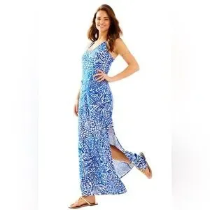 Vestido largo para mujer, Talla S, estilo es largo y tiene dos averturas en la parte derecha e izquierda de la pierna, es cuello V, es escotado, TIENE UN PEQUEÑO AGUJERO en la parte del CUELLO casi invisible ver la foto de desceipción. Es usado en buenas condiciones exepto el agujero. Largo 56 INCH.