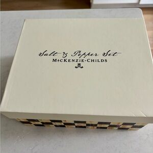 New in box, Mackenzie-Childs Woodland Gnome Salt and Pepper Shakers. Never used. Courtly check holiday