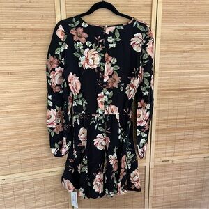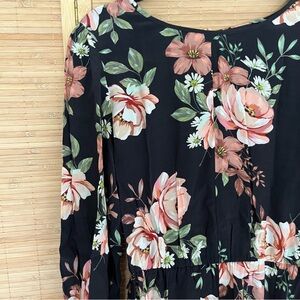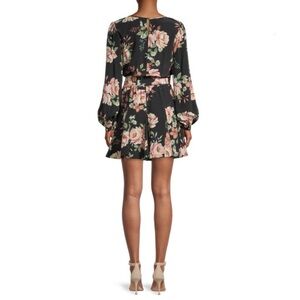 Evergreen floral-printed dress styled with feminine puff sleeves and a tie waist belt.