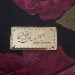 Cute vibrant, flowered Betsy Johnson small purse with gold chain, black shoulder strap