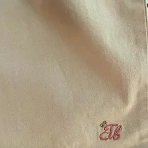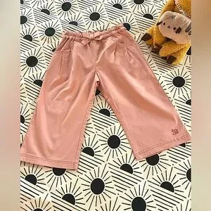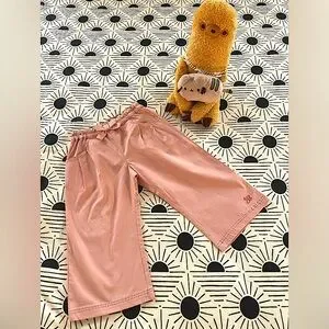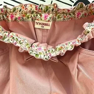 Your little girl will look super cute in these soft cotton twill peach paper bag waist cropped pants by Tinkerbell (Japanese children’s boutique label/purchased in Tokyo). Easy pull on style with elasticized waistband. Inside ditsy floral contrast fabric along waistband. Bow front accent on waist, pleated side pockets, embroidery on wide leg front, and patch pocket details on back. Japanese girl’s size 120 (Sz 7-8) equivalent to US Girl’s size 5-6. In excellent condition with minimal signs of wear, if any. Pet and smoke free environment.