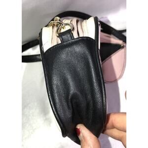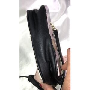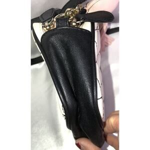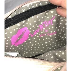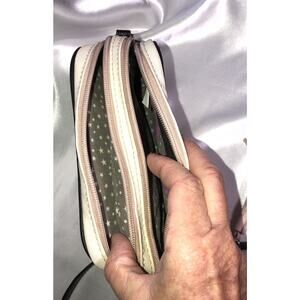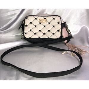 This is a Luv Betsey by Betsey Johnson small cross body purse. It has 2 zippered compartments. The pattern is quilted with stars. It is cream/white with black trim. It has a Heart shaped charm with tassels hanging off it. It measures. 6 in x 7 in **See all pictures including the measurement pictures**