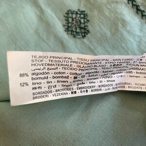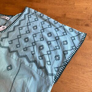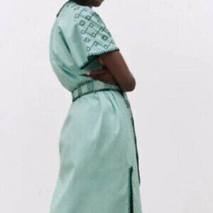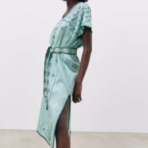 New with tags. Size XL Zara embroidered midi dress. Gorgeous seafoam color with embroidery along hem lines and on garment. Scoop neck with 17-inch side slits. Can be worn belted or unbelted.