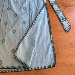 Dress measures approximately 48 inches from shoulder to hem; armpit-to-armpit measures 27 inches across and belt measures approximately 78-inches in length and is embroidered on both sides.