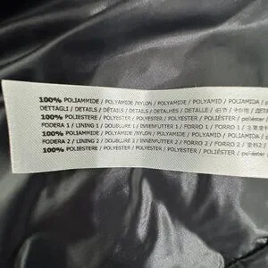 adjustable waist with drawstring, gold hardware with branding, zipper closure, pockets, contains non-textile parts of animal origin.