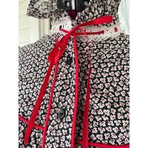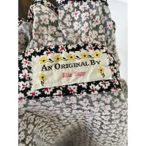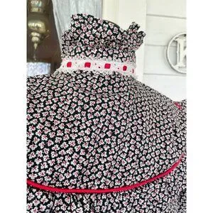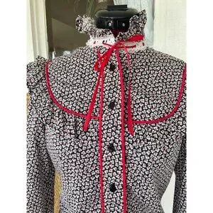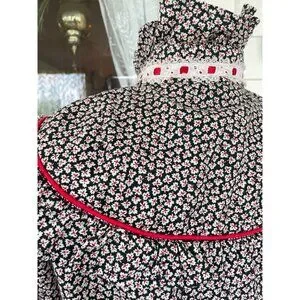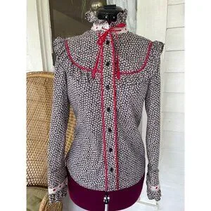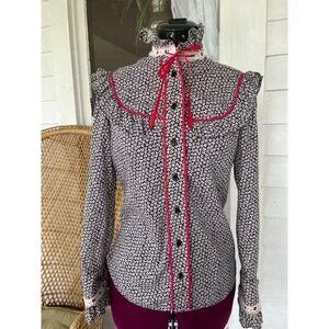 This vintage 1970s floral cotton ruffle shirt captures the spirit of the western style. The striking black and red design adds a touch of retro charm, making it perfect for anyone looking to make a bold fashion statement. This has a label in it indicating a handmade customer blouse. It feels like all cotton and based on the measurements it is a size small. See the photo of the measurements with the blouse flat and taken from one side. This is clean and free of holes and in good wearable condition.